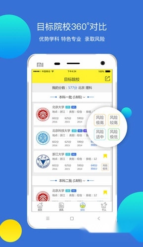 1.志愿智能推荐:输入高考分数、估分或模考成绩,以及所在省份和文理科类别,就能便捷获取不同风险等级的院校推荐清单。