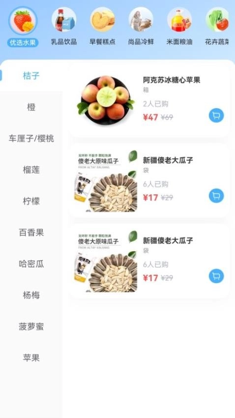 2、生鲜商品分类,涵盖新鲜蔬果、海鲜等品类,以满足用户的日常生活需求。