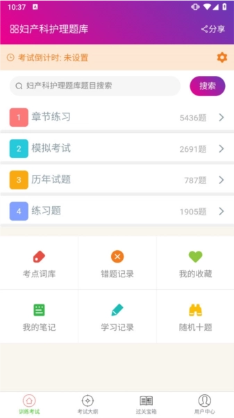 妇产科护理总题库涵盖了全面的考试资源,每道题目都配备了详细的试题解析。此外,题库还收录了不同年份的考试真题,考试评分标准与实际答题时长均与真实考试保持一致,并且题目严格对应各章节的知识点。同时,题库提供错题训练服务,以及多种专题训练功能,助力用户更高效地学习和掌握专题知识!