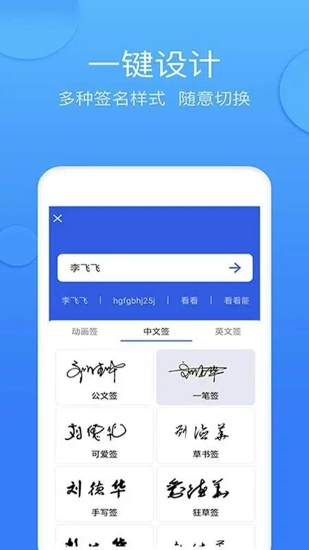 【风格多元】提供一笔签名、公文签名、动画签名、英文签名、潇洒签名、卡通签名等数十种签名风格,可自由挑选。