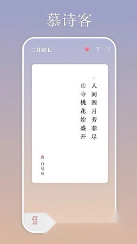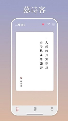 慕诗客是一款颇具价值的古诗词学习软件,旨在助力用户更轻松地学习古诗词。它收录了不同朝代诗人的作品,涵盖李白、杜甫、辛弃疾、王维等诗人的作品合集,用户能够欣赏这些诗人一生创作的各类诗词。用户可依据分类、作品、作者、朝代来筛选古诗,例如若想查找描写夏天的诗词,便可前往分类中的季节板块进行查找,从而看到众多优秀的相关诗词。
