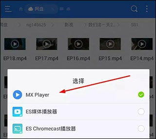 3、点击已新建好的百度网盘,进入后选择想要播放的视频,再选择MXplayer播放器进行播放。