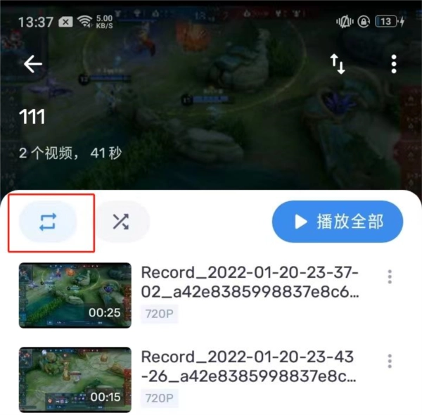 3、打开这个文件夹,接着点击下图所示的按钮,列表里的视频就会循环播放。