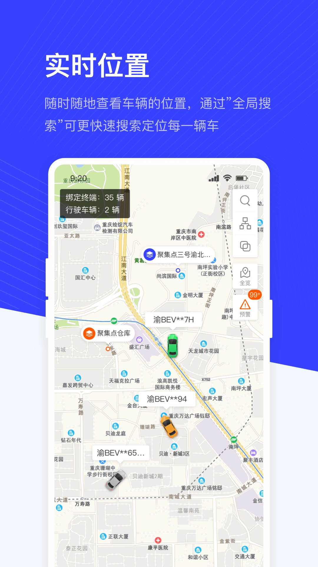 6、实时位置功能支持随时随地查看企业管理车辆的实时位置,借助“全局搜索”还能快速搜索并定位每一辆车。
