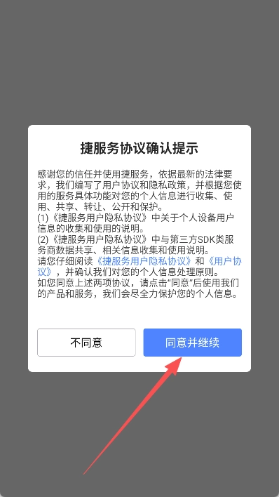 1、打开捷服务,在确认提升窗口中点击“同意并继续”。