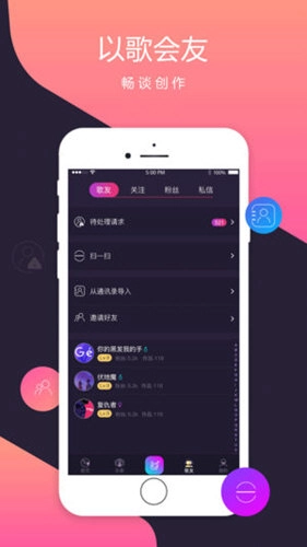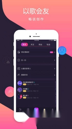 【以歌会友】主动关注他人,也能收获关注,创建粉丝群,还可和陌生用户私信交流,寻觅志同道合的知音。