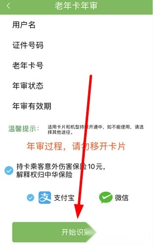 2、然后点击下方的“开始识别”按钮,就能依照提示完成老年卡的审核流程了。