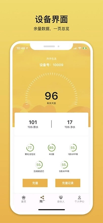 设备各级滤芯使用情况。个人中心绑定设备。