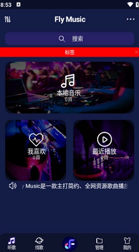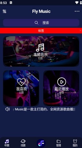 5、支持搜索功能:Fly音乐可依据歌曲名称或歌手信息为您查找歌曲
