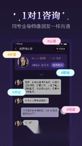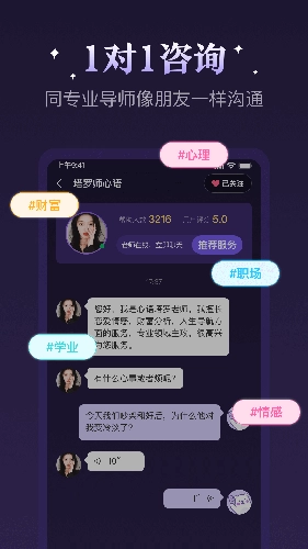 1、顺顺解惑是一款全新的心理咨询应用程序,可广泛应用于心理学领域与塔罗牌占卜场景。