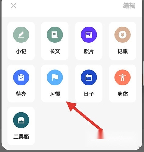 1、进行打卡操作前,需先创建一个习惯。点击探记底部菜单栏的+号按钮,会弹出一个选框,从中选择“习惯”选项即可。