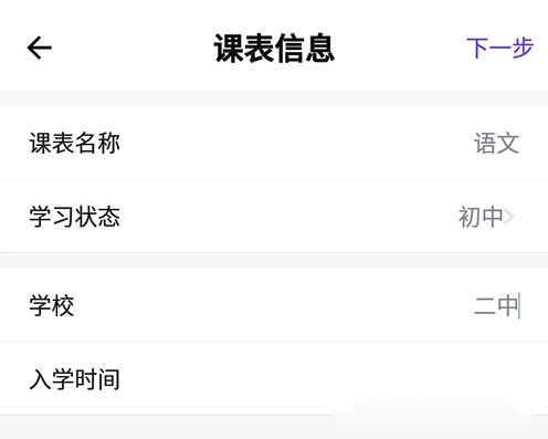 3、输入课表名称以及所在学习,点击下一步;