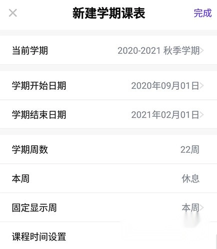 4、接着在新建的学期课表内填写相关内容,点击完成按钮,就能成功创建课表了。