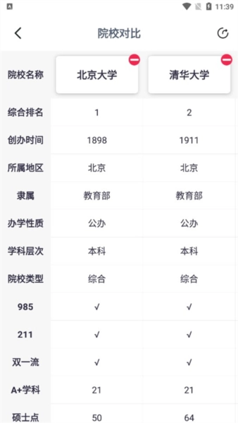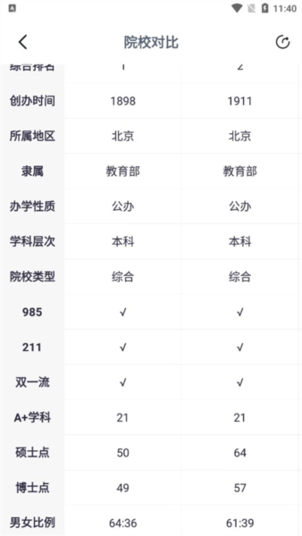 4、完成选择后,就能看到两所学校的详细对比信息了。