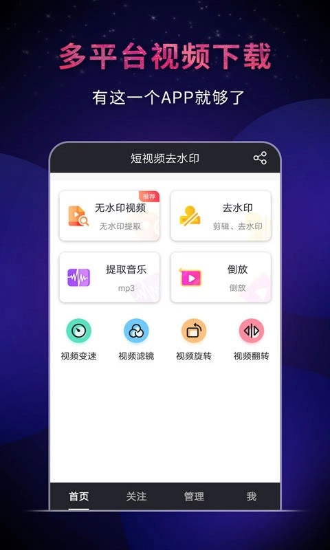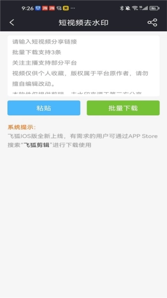 飞狐视频去水印应用拥有强大的视频编辑能力,还具备一键分享、背景音乐自定义、音频提取与视频压缩、视频翻转及裁剪、批量操作与关注主播,以及视频管理和自定义分类等特色功能,能为用户带来高效且便捷的视频编辑与分享体验。