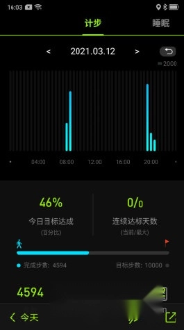 记录每日睡眠状况,通过图文形式呈现每日深睡时长、浅睡时长以及清醒次数,并对每周、每月的睡眠趋势进行统计分析。