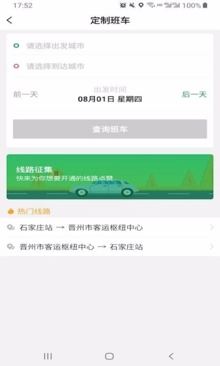 4、定制班车时,需选定起讫站点和出发时间,也可以直接选用系统推荐的路线。