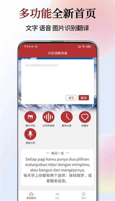 1、中文和印尼语的互译功能,无论是输入中文文本还是印尼语文本,都能得到对应的翻译结果。