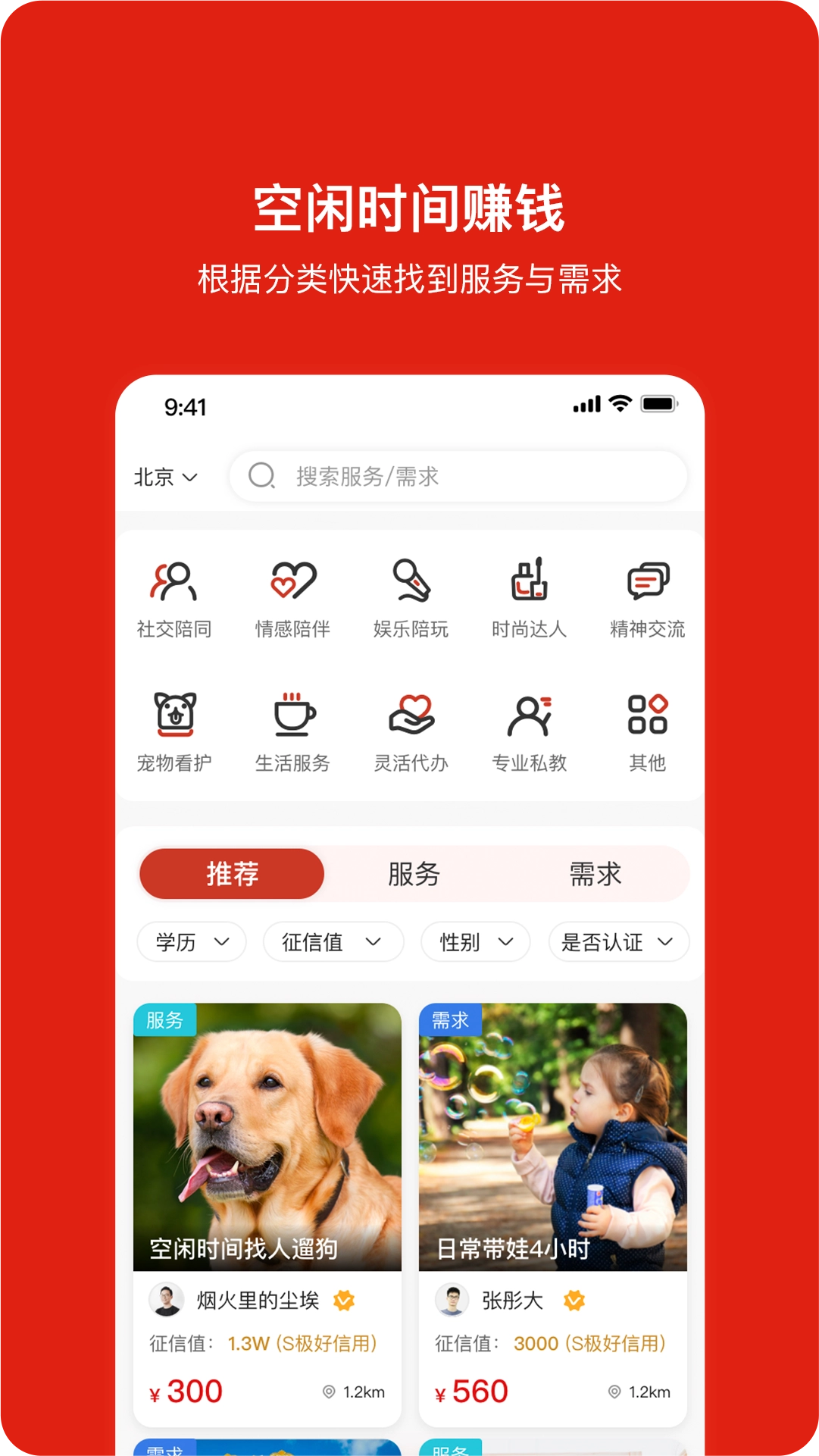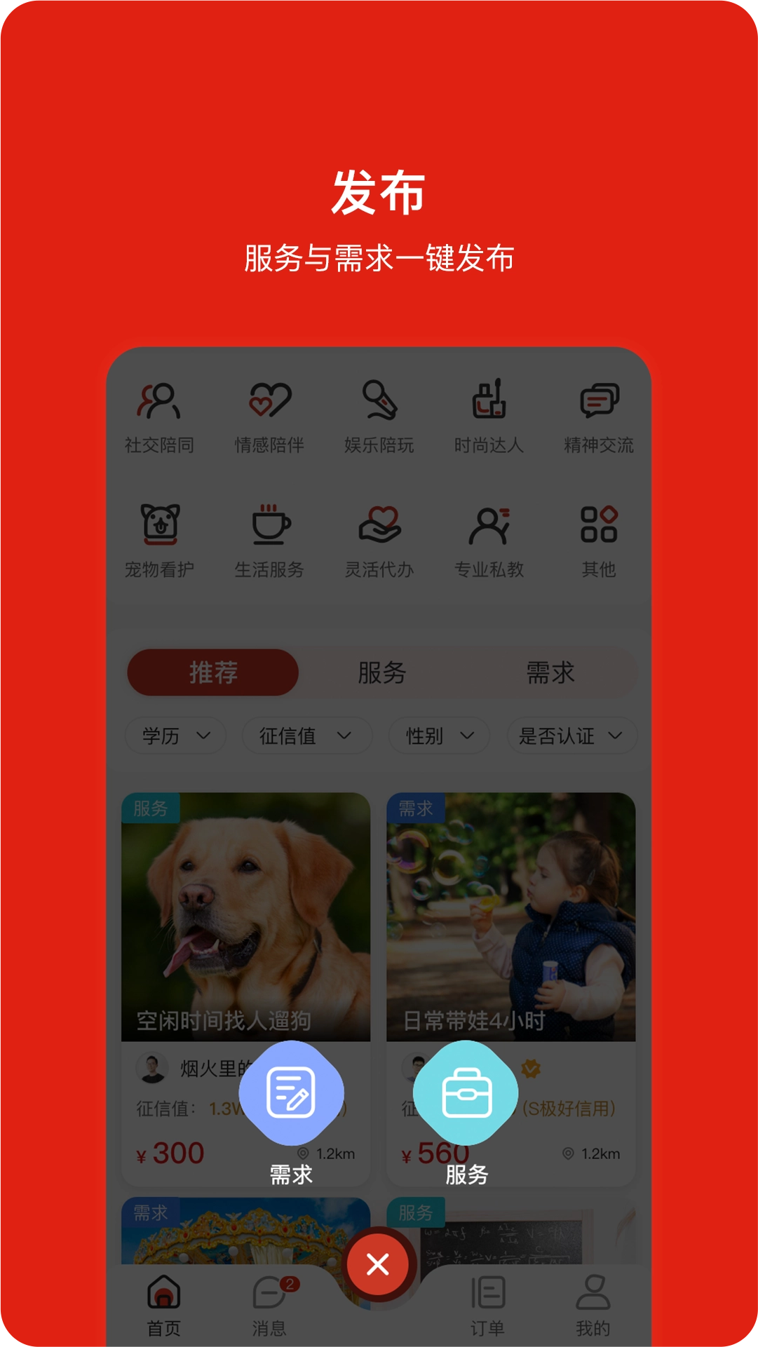 用户可以根据自身兴趣、特长等信息发布各类兼职服务,在助力他人高效解决问题的同时获取可观收益,丰富收入来源。这里的兼职服务覆盖宠物喂养、专业私教、娱乐陪玩、精神交流、社交陪同等多个领域,能满足不同人群的兼职需求;空闲时还能通过线上交流高效沟通,及时掌握对方需求,为服务开展提供支持,且支持线上支付保障交易安全。