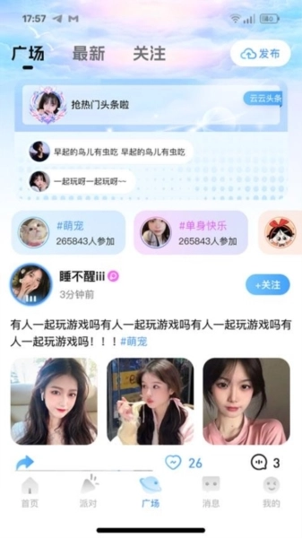 用户能够在互动广场浏览异性的动态,借助图文动态知晓异性的活动情况。