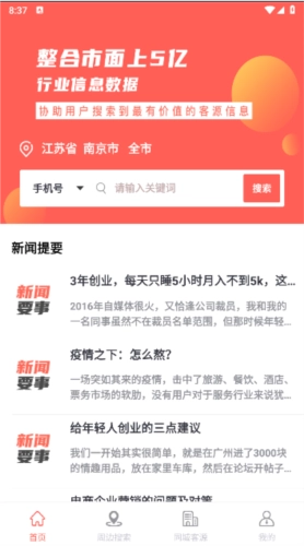 1、多维度客源搜索:通过整合跨行业的各类信息,精准锁定目标客源。