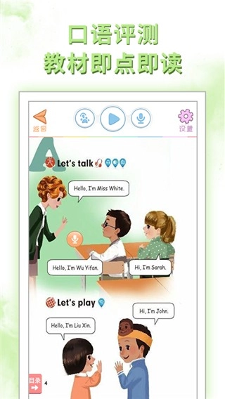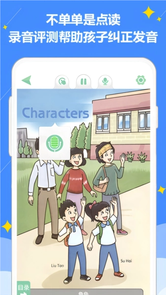 4、点读模式里包含多种学习方式,涵盖全部播放、单句点读和录音测评等功能。