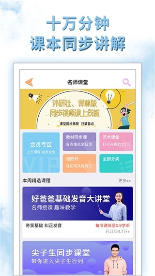 5、设置多种不同的课堂分区,对同步教材、艺术课堂、会员专区以及语数外等不同类别进行了区分;