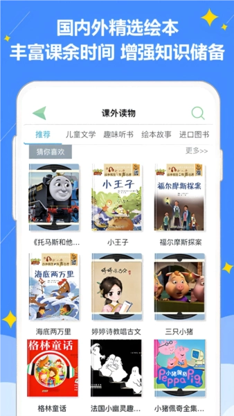 6、这里有海量的课外读物,分类也十分丰富,汇集了儿童文学、绘本故事以及趣味听书类等一万本不同的有声读物。