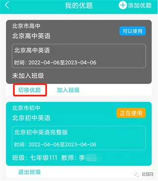 点击底栏的【我】进入【我的优题】页面,在高中或初中版区域下方点击【切换优题】,就能完成从初中版到高中版的切换。