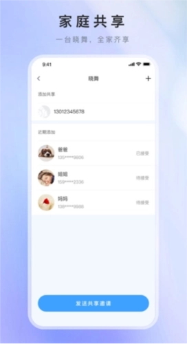 您可以把一台晓舞分享给家庭成员,以此实现家庭联控,还能在里面管理共享成员。