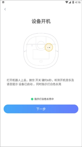 2、首先我们要打开机器人的上盖,按住开关键大约6秒,待听到开机音乐和语言提示设备已启动,且指示灯呈白色常亮状态时,点击“下一步”;