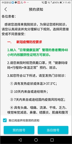2、仔细阅读预约须知后,结合个人时间安排,选择当日挂号或预约挂号。