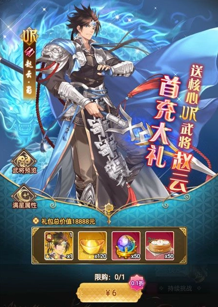首充礼包仅需6元,就能获得UR武将赵云。他堪称远程职业的克星,普通攻击对远程职业会造成额外伤害;主动技能不仅能攻击所有敌人,还会对敌方攻击最高的目标追加额外伤害。