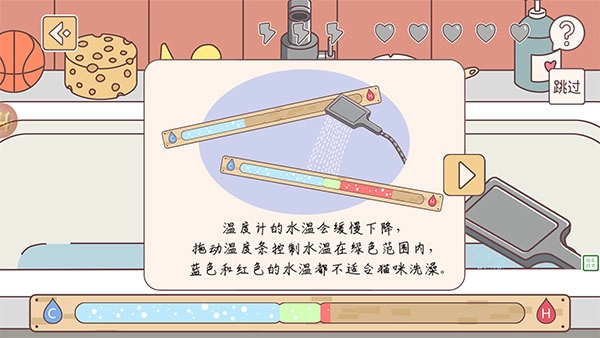 也别忘了给猫咪洗澡呀。温度计显示的水温会慢慢降低,这时候可以拖动温度条来调节,把水温控制在绿色区域内就好啦,要留意蓝色和红色对应的水温都不适合给猫咪洗澡哦。