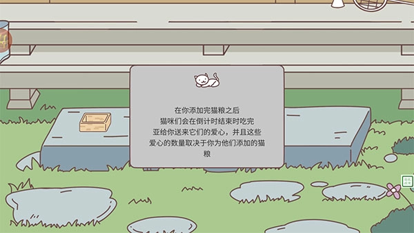 别忘记你那只可爱的小宠物啦,每天都得记得投喂它哟。等你添加好猫粮,猫咪们会在倒计时结束后把食物吃完,吃完之后还会给你送来它们的爱心呢。