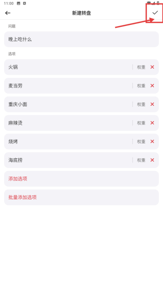 4、进入模板设置界面后,先将转盘选项设置为火锅、麦当劳等内容,接着点击右上角的确认图标,这样就完成了转盘的创建操作。