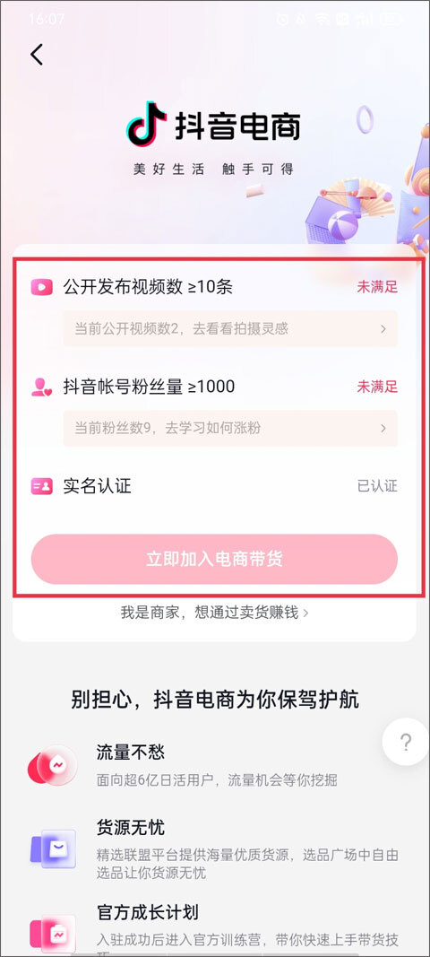 实名认证完成入驻抖音电商平台即可进行带货了。