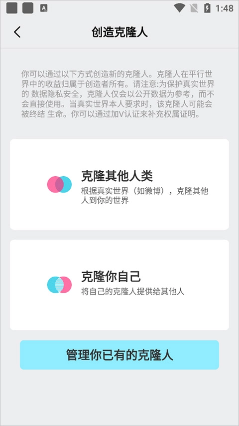 在发现页面里,用户能够创建专属于自己的克隆体,既可以选择复制他人的,也可以复制自己的。