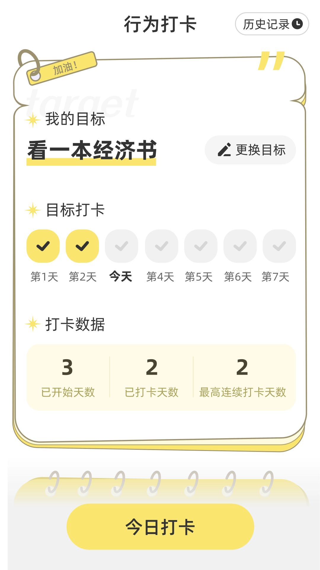 行为打卡页面支持设定个人目标并进行每日打卡操作,系统会自动记录打卡数据以及连续打卡天数,助力用户培养良好习惯并实时监督习惯养成的进度。