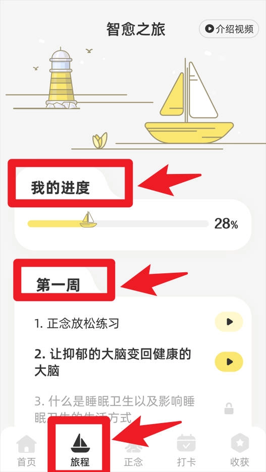 进入旅程页面后,你能查看自己的进度和当前学习周次,点击对应的模块就能按照课程安排开展冥想练习,逐步推进以达成目标。