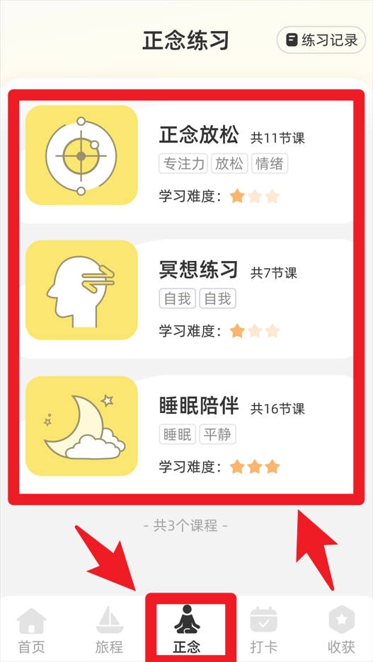 冥想课程分类:明确区分睡前冥想、办公减压等不同场景的内容。