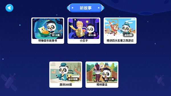 比如,点击“听故事”,就会出现适合孩子聆听的书籍,涵盖唐诗、童话、四大名著等类别;