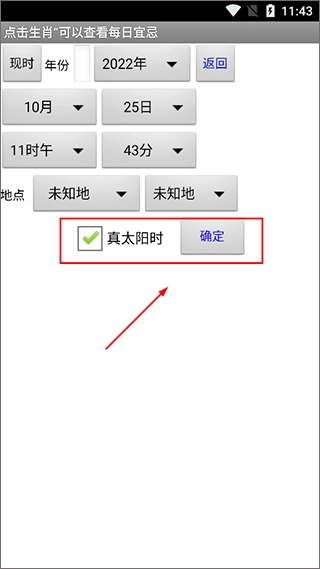 在真太阳时模式下,中间显示的红色时间为北京时间,其下方一行则对应着北京时间的日期。