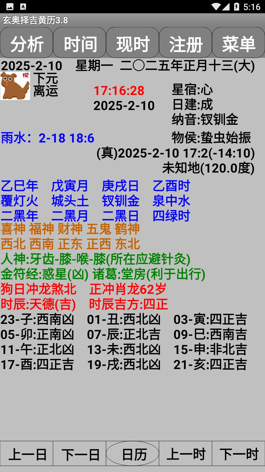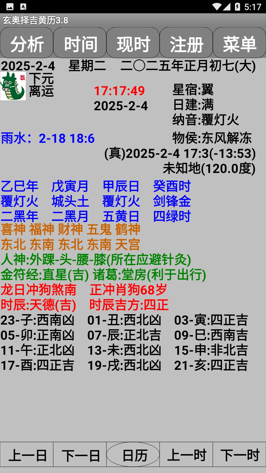 一天24小时的吉方、吉凶情况、时辰杂占。