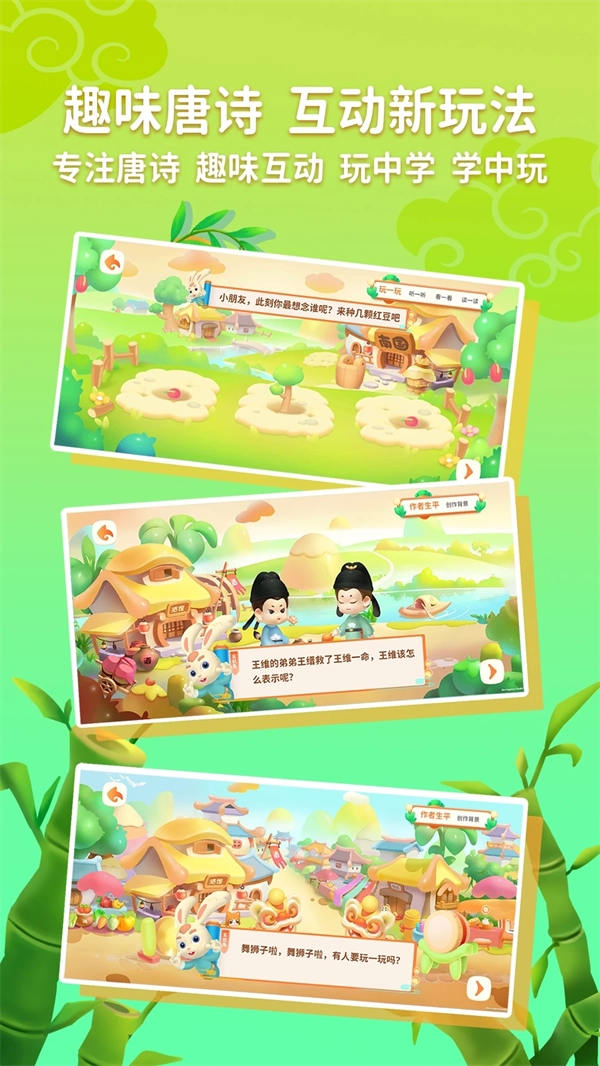 玄机兔点唐诗作为一款优质的古诗启蒙教育服务平台,致力于让每一位儿童都能获取优质的启蒙教育知识,提升文化素养。它采用更有趣精彩的学习方式,让孩子在轻松的氛围中学习古诗,实现边玩边学,从而让古诗启蒙教育学习更加高效。
