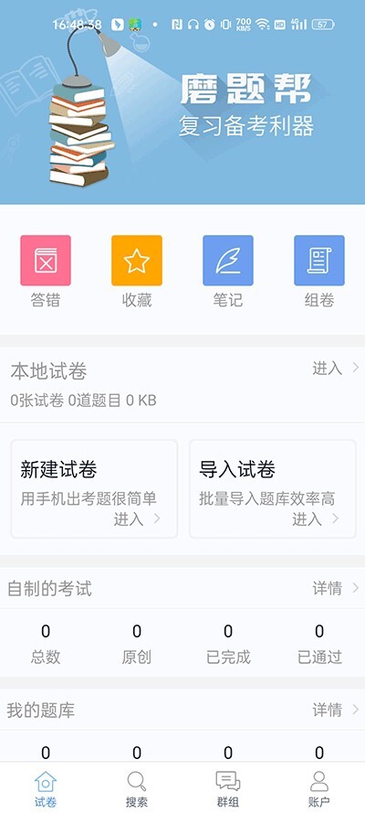 1、在手机上启动磨题帮App,进入首页后找到并点击“导入试卷”按钮。
