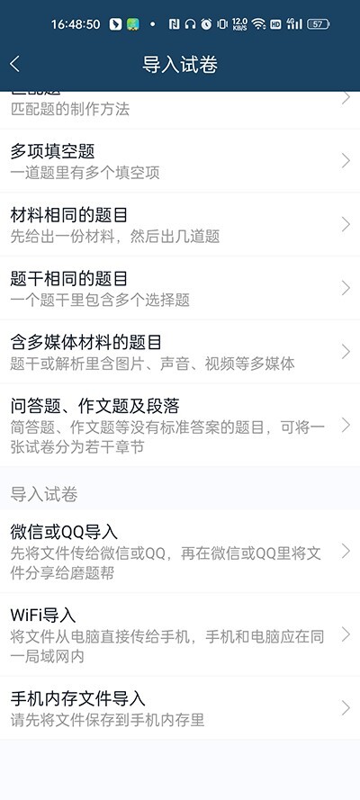 2、向下滑动页面,能看到三种导入方式:微信或QQ导入、WiFi导入和手机本地存储导入。前两种需要搭配电脑操作,要是仅用手机,就可以直接选择“手机内存导入”。