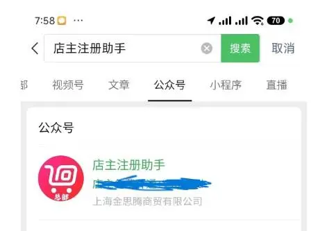 1.手机打开微信,搜索“店主注册助手”公众号。