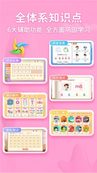 借助儿歌、图像、游戏、测试等丰富形式,点燃孩子学习拼音的热情,助力其专注力的提升、语言模仿能力的锻炼以及记忆力的增强等多方面综合能力的发展。