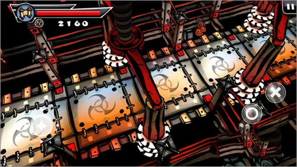 8、前行途中会遇到旋转的切割机,这在之前的关卡中也曾出现过。我们借助切割器旋转产生的间隙,翻滚至中间位置,随后便依靠这种方法持续前进。